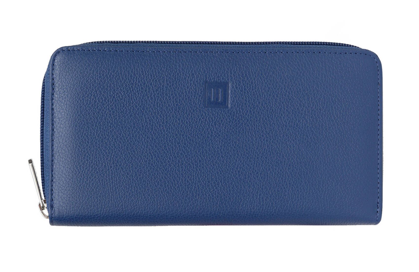 Portafoglio in pelle di vacchetta granata, Chiusura con cerniera, Finiture argento lucido.  Ci sono quattro tasche piatte, un portafoglio con cerniera e dodici scomparti per carte. È compatibile con carte di credito, CNI, patente di guida, passaporto e carta di circolazione.