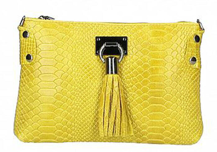 aspetto piccolo velluto sulla stampa Python. Puoi indossarlo a mano e alla spalla grazie alla sua tracolla rimovibile. La custodia in pelle è foderata in poliestere, hai un compartimento principale e una tasca piatta zippata. Le sue dimensioni sono lunghe 25 cm, profonde 3 cm e alte 17 cm per circa 0,25 kg.
