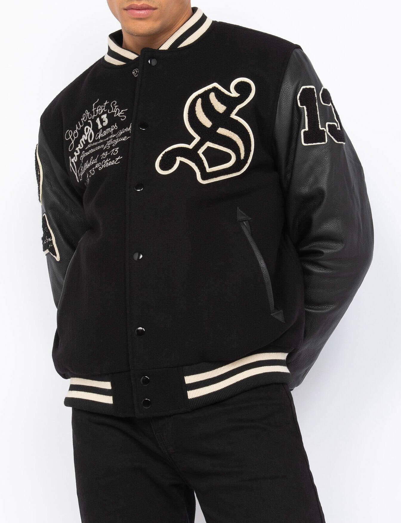 Il Bowler nero è caratterizzato dal suo colletto alla coreana a coste a piccole righe, che apporta un tocco sportivo e sofisticato, cosi come dalla sua chiusura con cerniera discretamente protetta a scatto, che unisce praticità e design raffinato. I stemmi e ricami, delicatamente posizionati sul petto, sul retro e sulla parte superiore delle maniche, rendono questa giacca in peluche sia iconica che audace, riflettendo lo spirito creativo e ribelle di Schott.