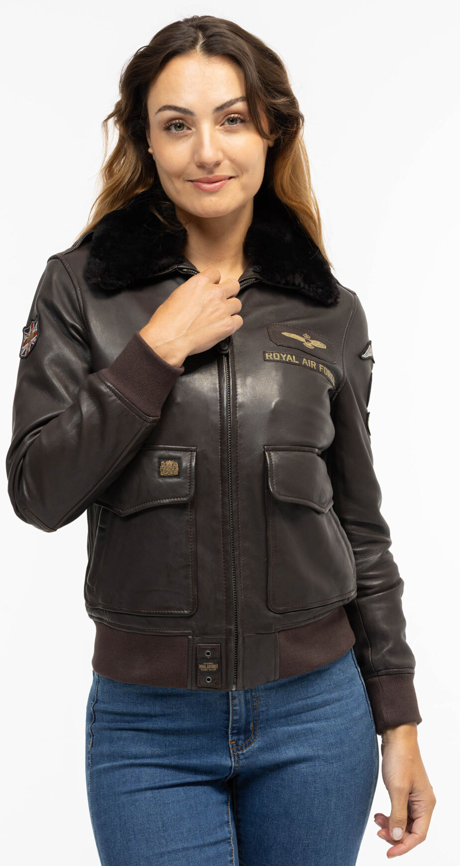 Giacca da donna in pelle marrone scuro, stile aviatore dell'aeronautica reale