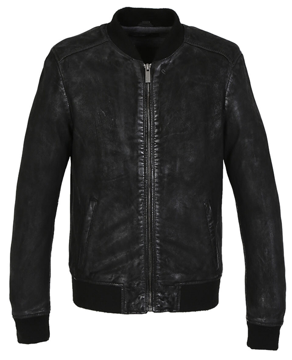 Giacca per bombardieri in pelle maschile della collezione Oakwood in colore nero. La giacca di pelle è realizzata in pelle di agnello flessibile e leggera, in un aspetto patinato invecchiato. Hai un piccolo colletto a maglia MAO, sul lato delle dimensioni delle dimensioni e delle maniche. Si chiude usando una zip centrale, ha due pregiudizi.