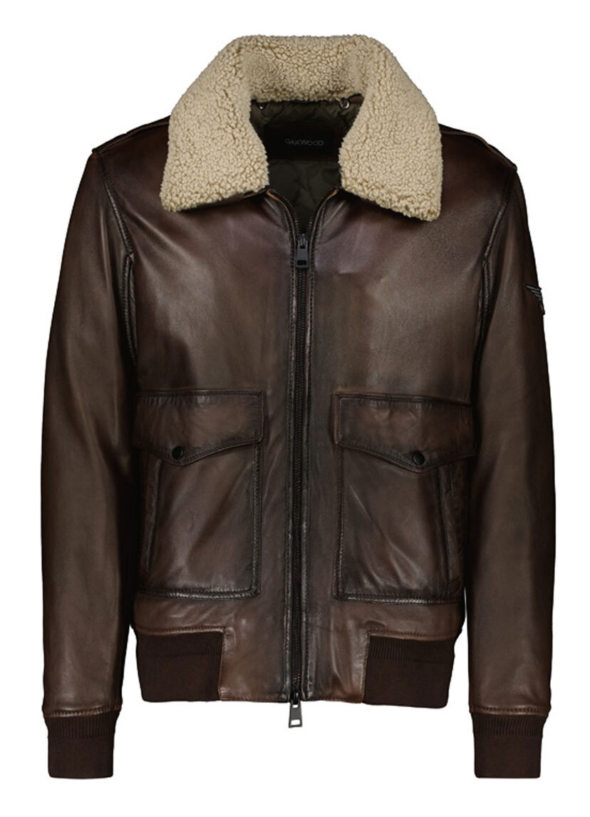 Giacca da uomo dal marchio Oakwood, in stile pilota di aviatore. È realizzato in pelle di agnello flessibile, aspetto liscio. Hai un colletto di camicia in pelle con un collare in pelliccia a fatica rimovibile. Hai una chiusura di illuminazione centrale con zipped, due grandi tasche placcate con lembo di pressione e tasche di pregiudizi. Lo troviamo costole sui polsi e sulle dimensioni, la sua fodera è in nylon e polpette in poliestere con tasche interne con pulsante di pressione.