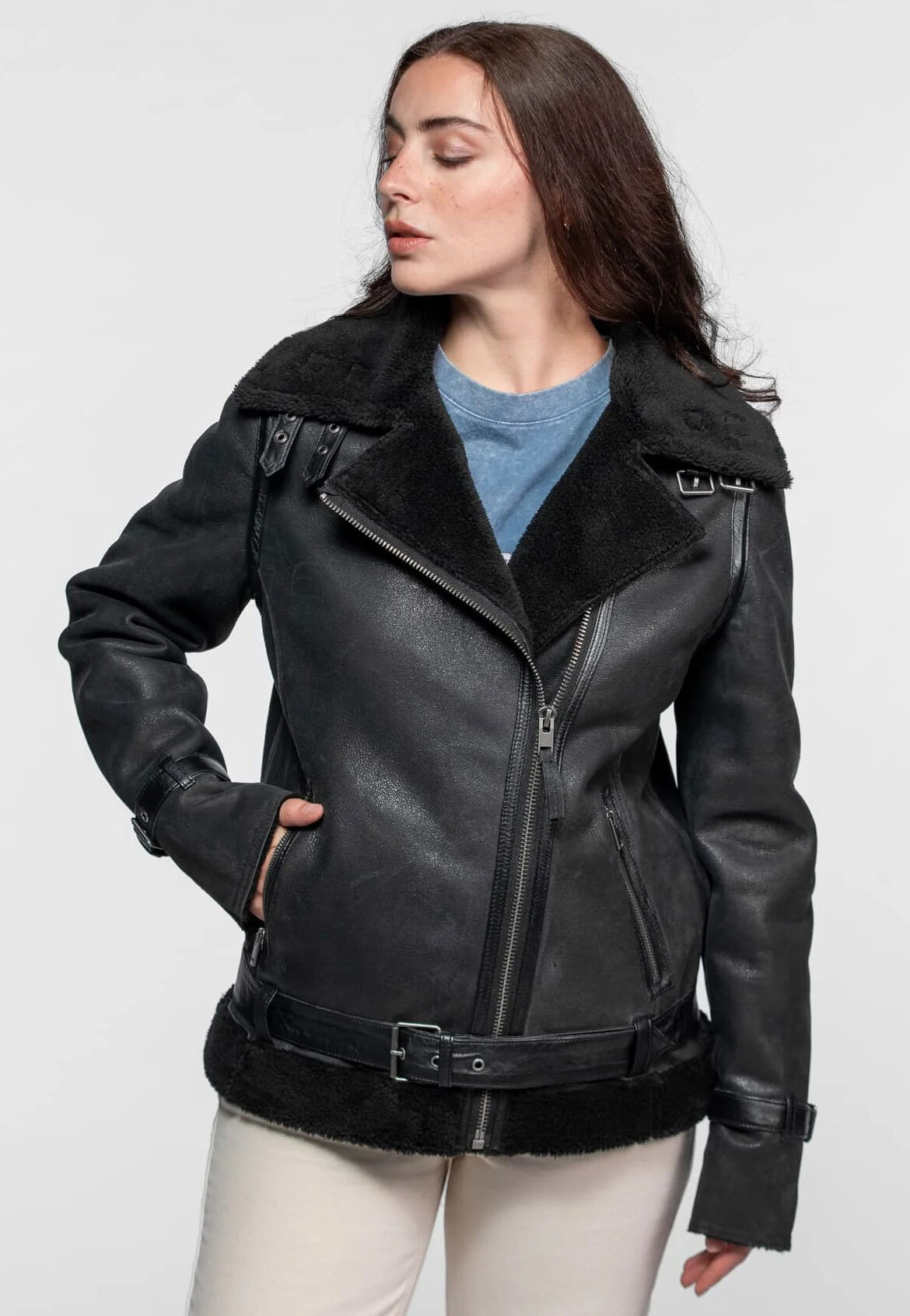 Affronta l'inverno con stile con questo bomber in pelle shearling. Interno in lana naturale per calore e comfort. Hai un ampio colletto largo con cinghie di serraggio, una chiusura asimmetrica con cerniera, due tasche esterne con cerniera. Caldo e avvolgente, unisce esterno robusto e interno in morbida lana, per un comfort ottimale e un look autentico. Le sue spalline regolabili e il taglio moderno lo rendono un capo pratico e intramontabile.