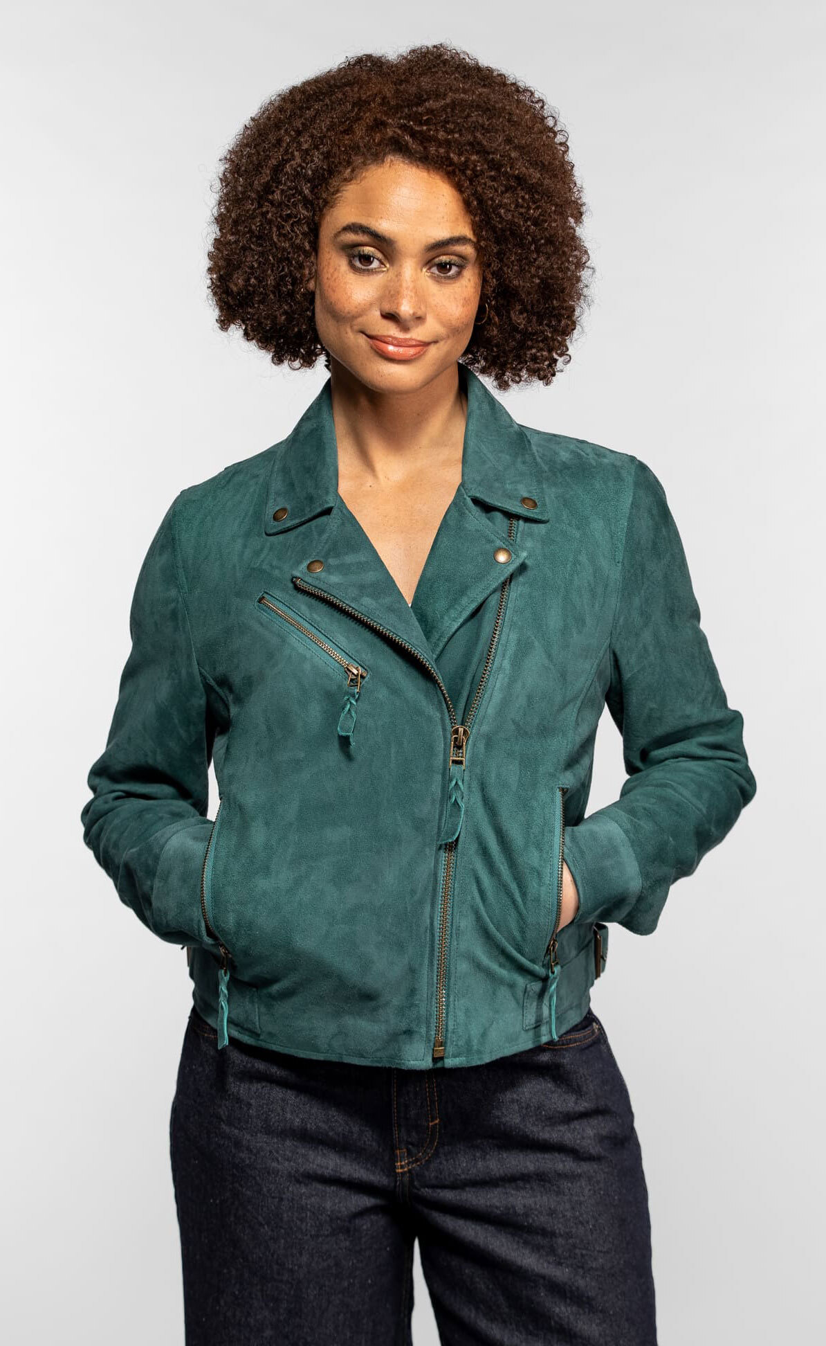 La pelle rigida a volte può non avere la fluidità necessaria per un outfit primaverile o estivo. Spesso temiamo l'aspetto troppo “biker” mentre cerchiamo la leggerezza. La giacca da donna in pelle scamosciata "Fern" del marchio Rose Garden offre questa alternativa perfetta: una carezza di velluto che esalta la tua silhouette con naturale eleganza.