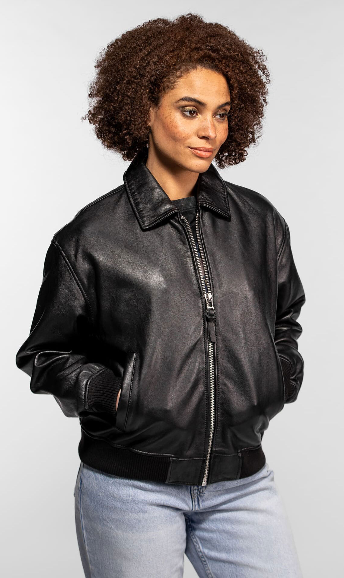 Giacca da donna in pelle nera in stile bomber roseto