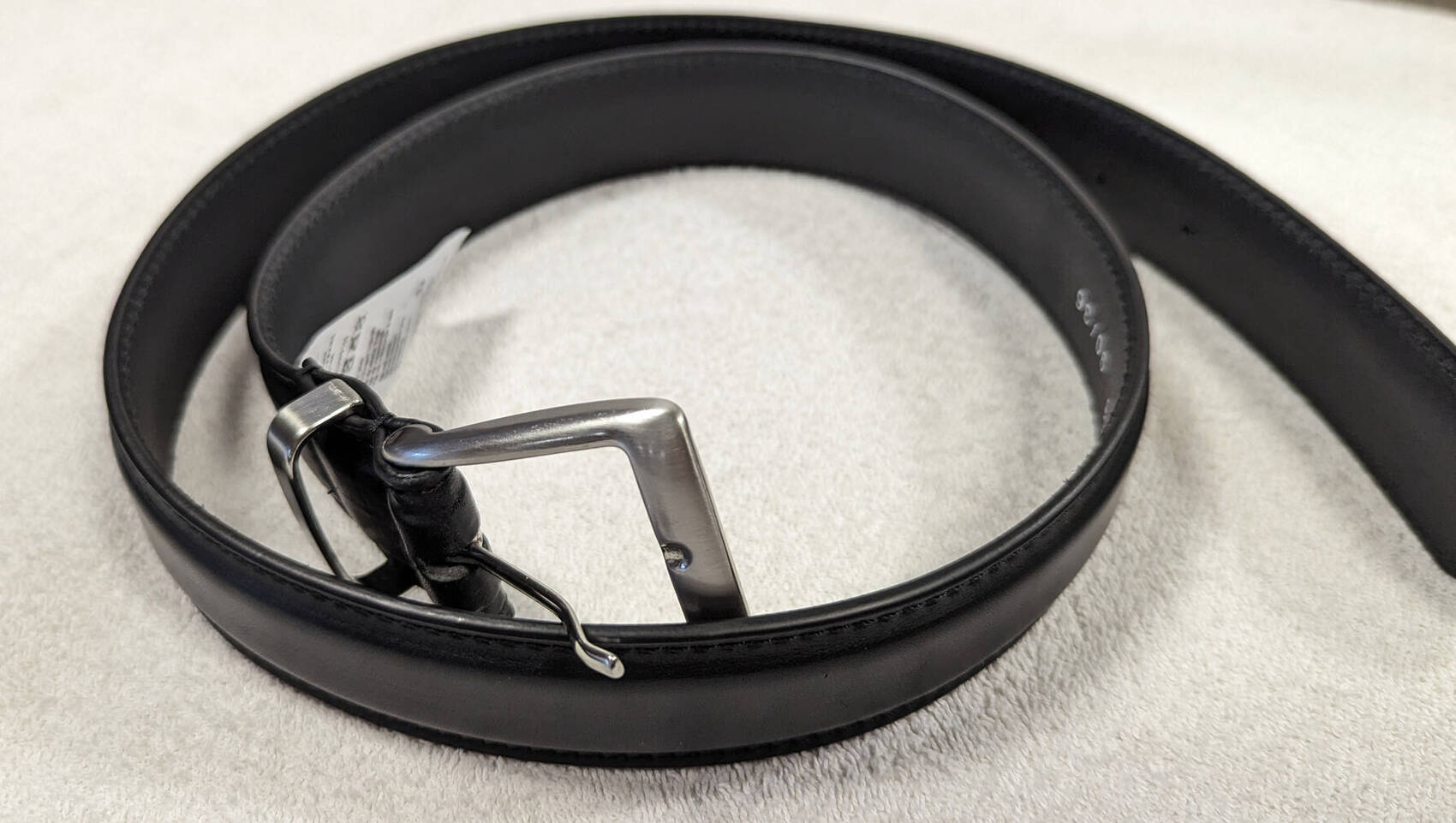 Cintura da uomo in pelle di vacchetta nera del marchio Schott, fibbia color argento, lavorata nella parte superiore pur rimanendo elegante