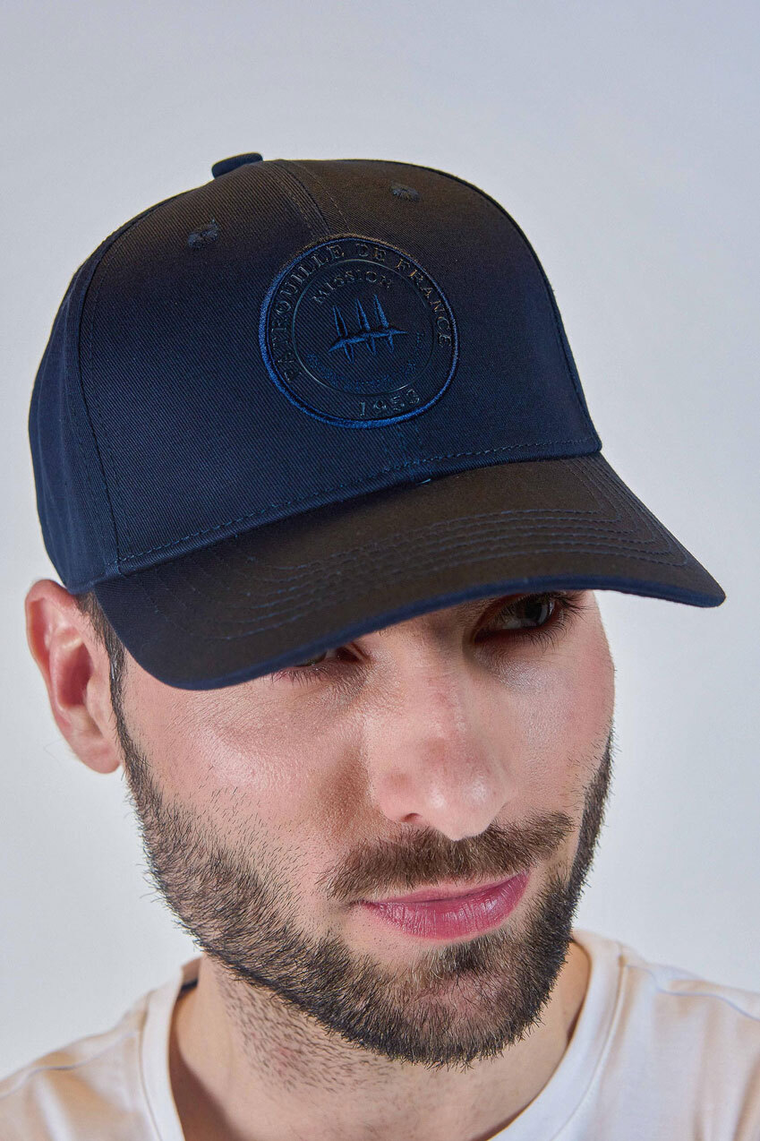 Berretto da uomo in cotone di colore blu scuro timbrato e concesso in licenza da Patrouille de France. Il berretto ha un taglio da baseball con visiera e sistema di regolazione sul retro.